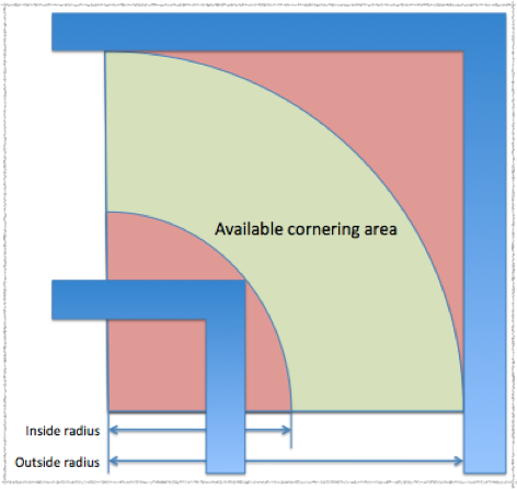 Of course you also need to know a little bit about the corner. The diagram is fairly self explanatory but it might be quite tricky to measure accurately. The key information is the inside and outside turn or curve radius.